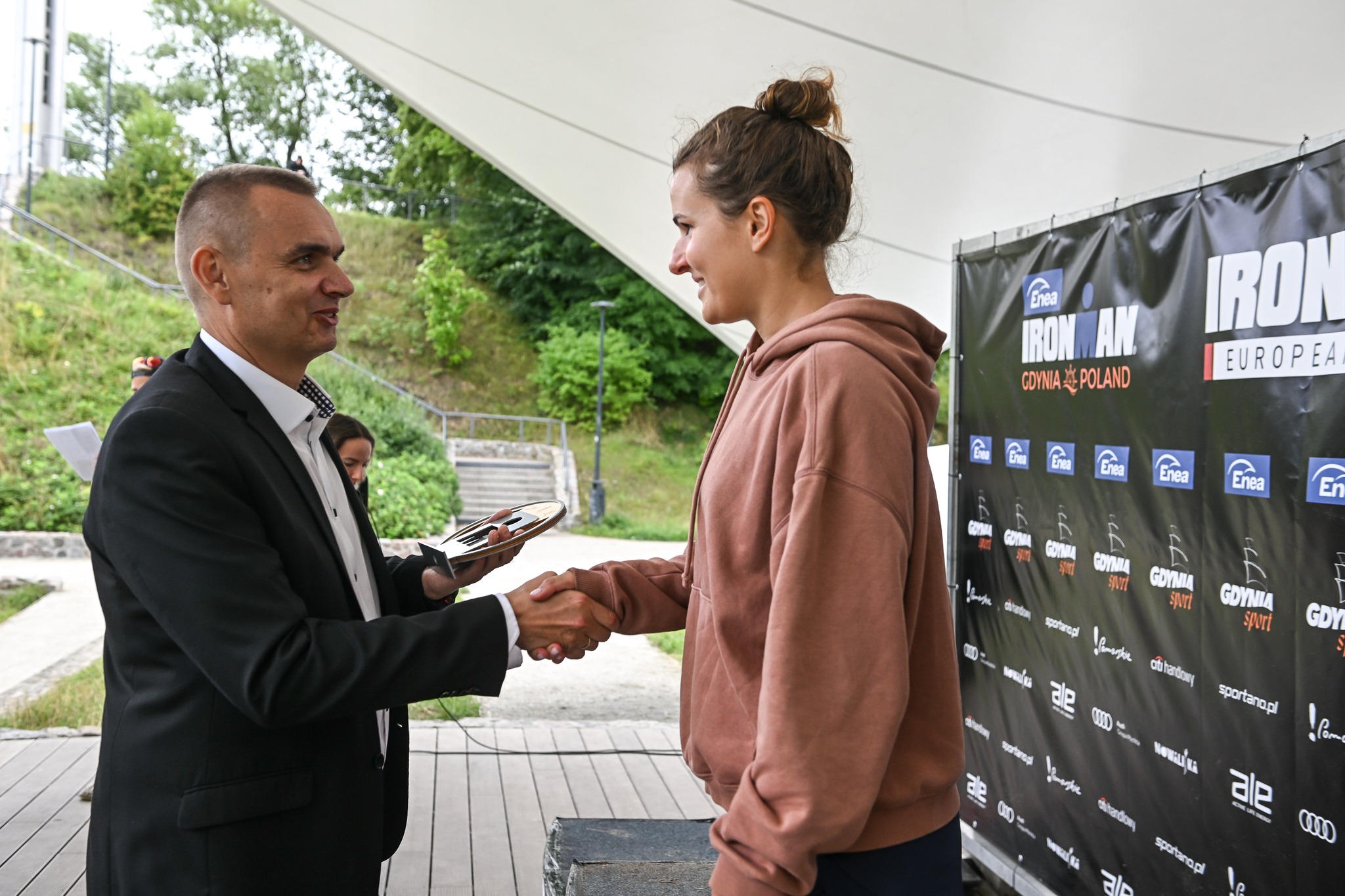 Niesamowite emocje, gorący doping i rywalizacja do samego końca – zakończyła się 11. edycja Enea IRONMAN Gdynia. W poniedziałek odbyła się dekoracja najlepszych zawodników na pełnym dystansie. Wyróżnienia wręczał dyrektor Gdyńskiego Centrum Sporu Przemysław Dalecki. – Enea IRONMAN Gdynia to nieodłączny element sportowych wydarzeń w naszym mieście. Już 11-krotnie, od 2013 roku, mogliśmy podziwiać zmagania sportowców w trzech konkurencjach: pływanie, rower i bieganie. Tegoroczna edycja, mimo że ze względu na warunki atmosferyczne, w niedzielę okrojona z części pływackiej, dostarczyła ponownie wielu emocji. Wystartowało łącznie kilka tysięcy uczestników, od imprez towarzyszących przeznaczonych dla biegaczy, amatorów i dzieci, do głównego wydarzenia, jakim był niewątpliwie pełen dystans IRONMAN. Kibice nie zawiedli. Wielu fanów przy trasie zawodów wpierało zawodników, a gorący doping z trybun na plaży witał finiszujących zawodnikówtworząc piękny, sportowy obraz – podsumował Dyrektor Gdyńskiego Centrum Sportu Przemysław Dalecki. Dyrektor GCS Przemysław Dalecki składający gratulacje za zajęcia miejsca na podium w Enea IRONMAN Gdynia. fot. Przemysław ŚwiderskiW poniedziałek 7 sierpnia odbyła się dekoracja najlepszych zawodników pełnego dystansu IRONMAN. Uroczystość miała miejsce w amfiteatrze na Kamiennej Górze. Nagrody otrzymali uczestnicy, którzy stanęli na podium w swojej kategorii wiekowej. Wyróżnienia wręczał Dyrektor Gdyńskiego Centrum Przemysław Dalecki.Następnie odbyło się wręczenie Slot Allocation, czyli przekazanie przepustek na Mistrzostwa Świata w IRONMAN.Organizator przyznał specjalną nagrodę „Najlepszy Gdynianin” dla miejscowego zawodnika, który ukończył najszybciej rywalizację w zawodach. Jako pierwszy mieszkaniec naszego miasta do mety dobiegł Paweł Reszke z rewelacyjnym wynikiem 8 godzin, 15 minut i 53 sekund – co dało mu 13. miejsce w klasyfikacji generalnej.Paweł Reszke wybrany najlepszym gdynianiem w Enea IRONMAN Gdynia 2023. fot. Marek Urbaniak / Gdyńskie Centrum SportuTo był niewątpliwie intensywny weekend w Gdyni. Od piątku do niedzieli toczyła się rywalizacja w wielu kategoriach. Od najmłodszych do najstarszych uczestników, każdy mógł wystartować i sprawdzić swoje umiejętności w imprezie z cyklu IRONMAN.Wszystkich zwycięzców oraz opisy poszczególnych wydarzeń znaleźć można w podsumowaniu tegorocznej edycji Enea IRONMAN Gdynia:PODSUMOWANIE ENEA IRONMAN GDYNIA 2023 Opublikowano: 08.08.2023 12:50 Autor: Paweł Stasiak (p.stasiak@gdyniasport.pl) Zmodyfikowano: 08.08.2023 12:56 Zmodyfikował: Agnieszka Janowicz