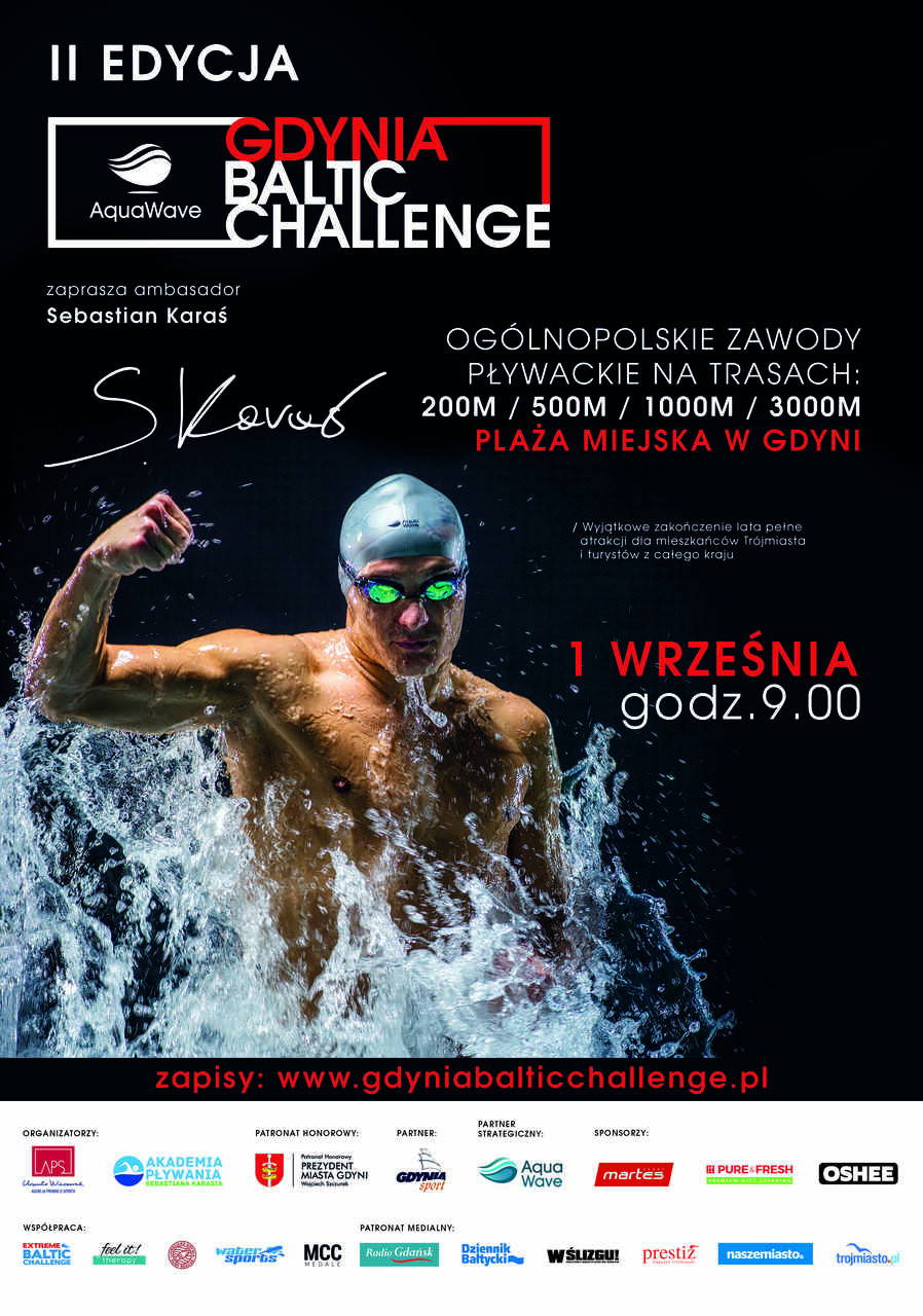 Wakacje się kończą, a 1 września wraca do Gdyni Baltic Challenge. Wydarzenie organizowane w wodach Zatoki Gdańskiej oraz na plaży Gdynia Śródmieście odbędzie się już po raz drugi. Ambasadorem imprezy jest Sebastian Karaś – najlepszy światowy pływak na otwartych akwenach. Patronat honorowy nad imprezą objął prezydent Wojciech Szczurek. Początek imprezy o godzinie 9:30. ZAPISY TYLKO DO CZWARTKU Będzie to już druga edycja zawodów pływackich Gdynia Baltic Challenge by Aquawave. Zeszłoroczna odbyła się równo rok po niebywałym osiągnięciu Sebastiana Karasia, który przepłynął wpław Bałtyku 100 km! Teraz szansę na zmierzenie się z wodami morskimi mają kolejni śmiałkowie.Nikogo nie trzeba przekonywać, że jest to szczególna impreza dla wszystkich fanów pływania na wodach otwartych. Dzięki wyznaczeniu trasy wzdłuż Bulwaru Nadmorskiego możliwe będzie śledzenie niemal każdego etapu emocjonującej rozgrywki i dopingowanie uczestników na odcinku od pomnika Rybek po Polankę Redłowską. Na chętnych czekają cztery różne dystanse (200 m, 500 m, 1 km, 3 km). W zawodach mogą wziąć udział już 10-latkowie (10–11 lat dystans 200 m, 12–13 lat dystans 500 m, 14–15 lat dystans 1 km). Cena pakietu uzależniona jest od długości dystansu w jakim chcemy wystartować i oscyluje od 40 do 90 złotych. Każdy z uczestników otrzyma pamiątkowy medal z autografem Sebastiana Karasia. Wyniki oparte będą o rejestratory czasowe. Dla czołowych zawodników każdej trasy przygotowane są nagrody.Warto dodać, że uczestnicy będą mogli skorzystać ze strefy relaksu z Feel It Therpay oraz strefy Kids dla najmłodszych. W dwóch namiotach znajdujących się w pobliżu bramy startowej zostanie stworzone miejsce dla uczestników oraz ich rodzin.Harmonogram zawodów:09:30 Otwarcie zawodów 10.00 Start I serii (dzieci) 10:45 Start II serii (16-20 lat) 10:55 Start III serii (21- 25 lat) 11:05 Start III serii (26 – 30 lat) 11:15 Start IV serii ( 31-35 lat) 11:25 Start V serii (36-40 lat) 11:35 Start VI serii (41- 45 lat) 11:45 Start VII serii (46- 50 lat) 11:55 Start VII serii (51-55 lat) 12:05 Start IX serii (56 lat i więcej) 12.15 Start X serii (OPEN TRI) Dekoracje rozpoczną się o godzinie 12:30 na scenie głównej zlokalizowanej na plaży Gdynia Śródmieście. Biuro zawodów będzie czynne od godziny 8:00 do 14:30. Po więcej informacji zapraszamy na gdyniabalticchallenge.pl. Opublikowano: 28.08.2019 07:00 Autor: Michał Kozłowski (m.kozlowski@gdynia.pl) Zmodyfikowano: 28.08.2019 09:05 Zmodyfikował: Małgorzata Omachel - Kwidzińska