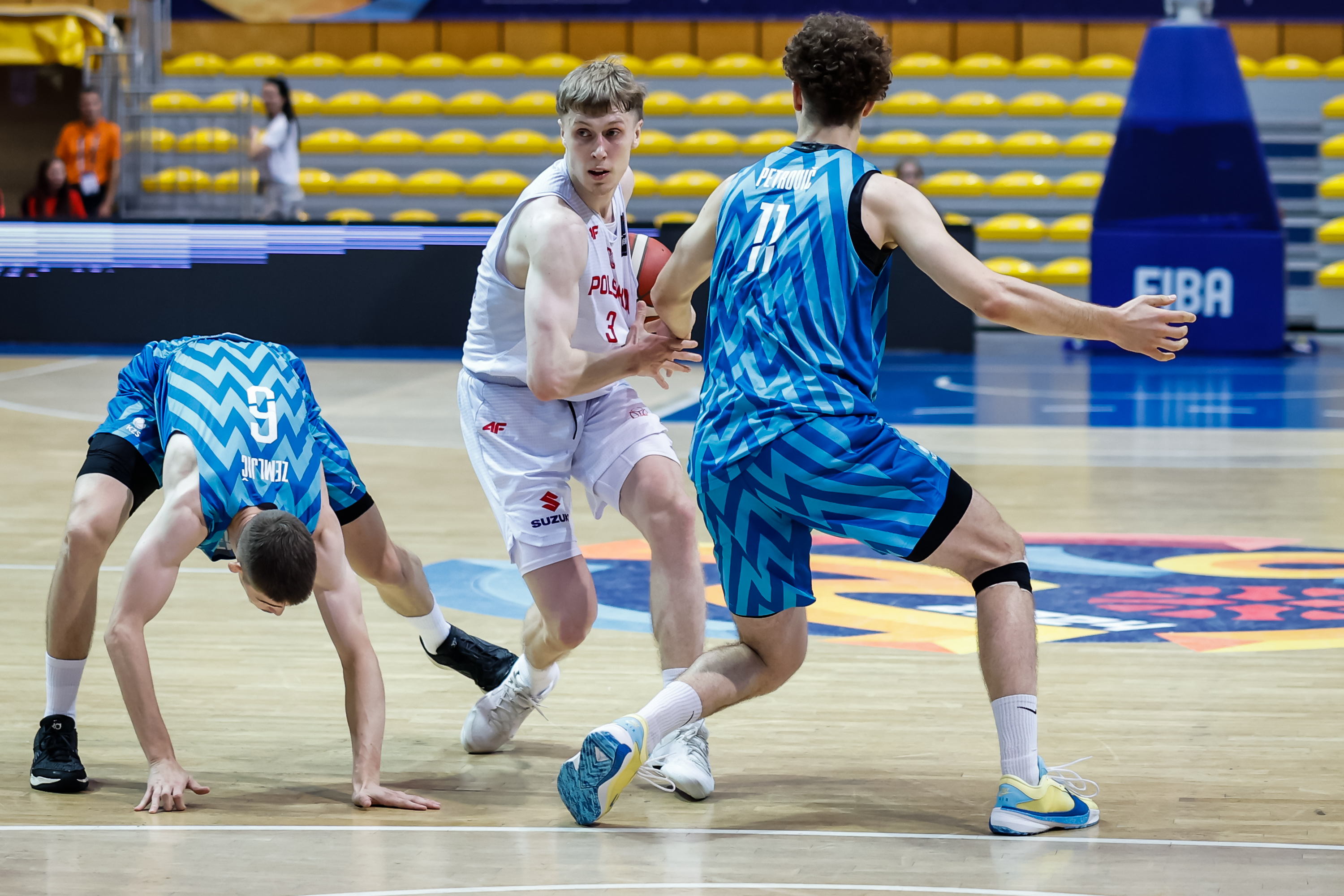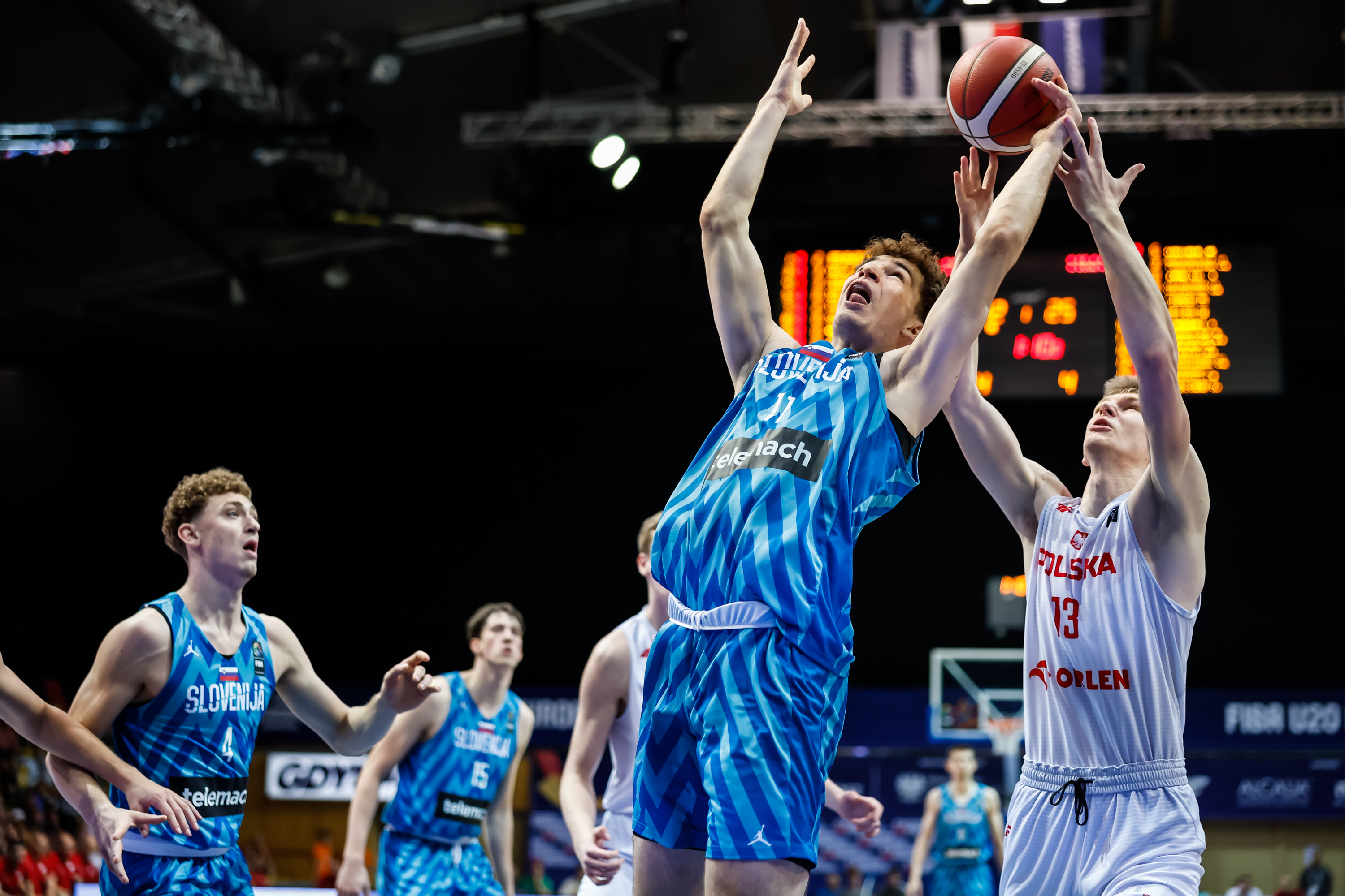 Reprezentacja Polski do lat 20 mężczyzn przegrała ze Słowenią 72:73 w ćwierćfinale EuroBasketu w Gdyni i zagra o miejsca 5-8. 20 punktów dla naszej drużyny rzucił Anthony Wrzeszcz. Pomimo porażki Polacy już teraz zanotowali najlepsze miejsce w historii w kategorii U20 mężczyzn. Wygrana nad Włochami odbiła się na zdrowiu Biało-Czerwonych, zwłaszcza Anthony'ego Wrzeszcza, który przy wejściu pod kosz w trzeciej kwarcie po kontakcie z rywalem doznał dużego rozcięcia przedramienia. Sztab medyczny bardzo szybko poradził sobie z krwawieniem i obrońca był gotowy do gry jeszcze przed końcem meczu, ale na boisko już nie wszedł. W czwartek mógł nie zagrać, ale na własną prośbę pojawił się w składzie meczowym. Najlepszy punktujący zespołu (przed meczem ze Słowenią średnio 12 punktów na mecz) wyszedł na parkiet w pierwszej piątce.Akcja pod koszem podczas meczu EuroBasketu U20 w Gdyni (fot. Wojciech Figurski/400mm.pl)Polacy w pierwszych minutach nie złapali jednak odpowiedniego rytmu. Brakowało dokładności oraz cierpliwości w ataku, zaś rywale byli pod tym względem bezbłędni. Po serii 12 punktów z rzędu drużyna z jednego z najbardziej zielonych krajów świata objęła prowadzenie 14:2.Nasz zespół próbował odrabiać straty, ale pojedyncze skuteczne akcje w ataku nie zdołały zatrzymać Słoweńców. Dopiero w momencie, gdy strata sięgnęła już 18 punktów gra KoszKadry U20 zaczęła wyglądać lepiej. Morale w zespole podniosły dwie trójki z narożnika boiska Jakuba Andrzejewskiego i Wrzeszcza, po których przewaga zmalała do dziesięciu punktów.Akcja pod koszem podczas meczu EuroBasketu U20 w Gdyni (fot. Wojciech Figurski/400mm.pl)Mocną stroną Słoweńców we wcześniejszych spotkaniach EuroBasketu była gra na tablicach - zwłaszcza zbiórki w ataku. Polacy miejsce w gronie najlepszych ośmiu drużyn Starego Kontynentu wyrywali zaś w dużej mierze dzięki nieustępliwości i dużemu zaangażowaniu w walce o każdą piłkę. Ten element w połączeniu z zespołową grą pozwolił odrabiać także straty w kolejnych minutach zawodów.Konsekwentnie punktował Wrzeszcz, a trafienia zanotowali Antoni Siewruk i Jakub Szumert. Na koniec pierwszej połowy Polacy przegrywali siedmioma punktami, ale najchętniej zostaliby na boisku dłużej, kontynuując odrabianie strat do rywali. Energię skumulowali na początek trzeciej odsłony, gdy przez pięć minut nie pozwolili Słoweńcom zdobyć punktu. W tym czasie Polacy po trójce Maksymiliana Wilczka wyszli na prowadzenie 43:41, powiększając je później do czterech punktów. Początek drugiej połowy nasz zespół wygrał 11:0.Akcja pod koszem podczas meczu EuroBasketu U20 w Gdyni (fot. Wojciech Figurski/400mm.pl)Kolejne minuty to wyrównana gra z obu stron, w trakcie której po akcji Kuby Piśla na początku czwartej kwarty Polacy objęli prowadzenie 57:52. Nasz zespół szybko stracił jednak 10 punktów z rzędu i ponownie musiała odrabiać straty.Nawet w trudniejszych momentach publiczność, która szczelnie wypełniła Polsat Plus Arena dodawała otuchy naszym zawodnikom, wzmacniając wiarę drużyny w końcowy sukces w trudniejszych momentach. Punkty Andrzejewskiego oraz Piśli i ponownie był remis. Na upragnione prowadzenie 70:67 trójką Polaków wyprowadził Wrzeszcz.Akcja pod koszem podczas meczu EuroBasketu U20 w Gdyni (fot. Wojciech Figurski/400mm.pl)Niestety końcówka należała do Słoweńców. Błędy sprawiły, że to ostatnie cztery punkty w meczu rzucili rywale, którzy po końcowej syrenie mogli świętować awans do półfinału. Nam pozostaje walka o miejsca 5-8.Piątek jest dniem przerwy w mistrzostwach. Kolejne spotkanie Biało-Czerwoni zagrają w sobotę z Czechami. W przypadku wygranej zmierzą się o piąte miejsce, porażka sprawi, że w niedzielę będą rywalizować o siódmą lokatę.Polska - Słowenia 72:73 (15:27, 19:14, 19:9, 19:23)Polska: Anthony Wrzeszcz 20 (4), Jakub Andrzejewski 16 (3), Kuba Piśla 8, Antoni Siewruk 8 (2), Krzysztof Kempa 5, Jakub Szumert 4, Maksymilian Wilczek 4 (1), Aleksander Busz 3, Conrad Luczynski 2, Jakub Stupnicki 2, Janusz Ratowski 0.Najwięcej dla Słowenii: Urban Klavzar 17 (2), Gasper Kocevar 10, Matija Samar 10 (1) Materiał pochodzi ze strony https://pzkosz.pl Opublikowano: 19.07.2024 09:22 Autor: Piotr Suchenia (p.suchenia@gdyniasport.pl) Zmodyfikowano: 19.07.2024 12:42 Zmodyfikował: Paweł Jałoszewski