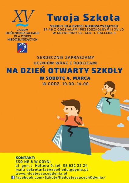 XV Liceum Ogólnokształcące dla Dzieci Niedosłyszących w Gdyni zaprasza ósmoklasistów z niepełnosprawnością słuchową lub afazją wraz z rodzicami na dzień otwarty szkoły. W programie mnóstwo atrakcji naukowych, muzycznych, kreatywnych, eksperymentalnych, stolarskich i innych w wyjątkowych przestrzeniach naszej szkoły. Możliwość spotkania i konsultacji z psychologiem, pedagogiem, logopedą, nauczycielami i dyrekcją szkoły oraz konsultacji na temat możliwości rozwoju, jakie oferujemy dzieciom z niepełnosprawnością słuchową lub afazją. Do zobaczenia! Opublikowano: 23.02.2023 09:38 Autor: Paweł Jałoszewski (pawel.jaloszewski@gdynia.pl) Zmodyfikowano: 23.02.2023 09:40 Zmodyfikował: Paweł Jałoszewski