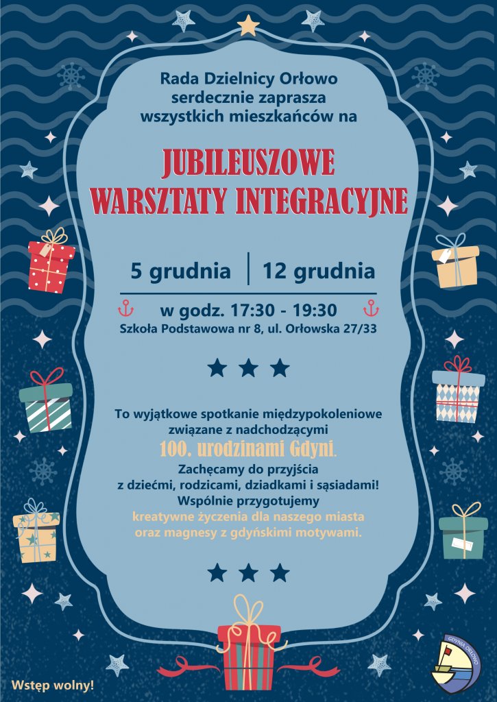 Rada Dzielnicy Orłowo serdecznie zaprasza wszystkich mieszkańców na wyjątkowe, międzypokoleniowe spotkania z okazji zbliżających się 100. urodzin Gdyni! Wydarzenia odbędą się 5 oraz 12 grudnia 2025 r. w godz. 17:30–19:30 w Szkole Podstawowej nr 8 przy ul. Orłowskiej 27-33.Czekają nas kreatywne, pełne dobrej energii warsztaty, podczas których: przygotujemy wspólne życzenia urodzinowe dla Gdyni, stworzymy unikatowe magnesy z gdyńskimi motywami, spędzimy czas w sąsiedzkiej, rodzinnej atmosferze. Zapraszamy dzieci, rodziców, dziadków, sąsiadów – wszystkich, którzy chcą poczuć ducha naszego miasta i spotkać się w twórczej, integracyjnej przestrzeni!Wstęp wolny! Opublikowano: 02.12.2025 12:22 Autor: Joanna Majchrowska (joanna.majchrowska@gdynia.pl) Zmodyfikowano: 02.12.2025 12:54 Zmodyfikował: Paweł Jałoszewski