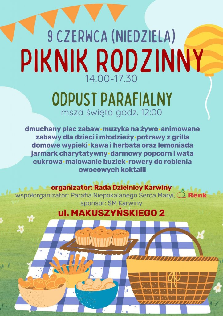 Rada dzielnicy Karwiny oraz Parafia Niepokalanego Serca Maryi zapraszają na festyn rodzinny dla dzieci, ktory odbędzie się już 9 czerwca w niedzielę (za kościołem Parafii). Zapewniamy wiele atrakcji: dmuchany plac zabaw, muzyka na żywo, którą po raz pierwszy w historii festynu zaprezentuję profesjonalny DJ, godzinny koncert dla dzieci z najlepszymi dziecięcymi hitami, więc jeżeli Wasze dzieci lubią "wyginać ciało śmiało" to jest to koncert specjalnie dla nich, animowane zabawy dla dzieci i młodzieży, domowe wypieki, kawa i herbata oraz lemoniada, jarmark charytatywny, darmowy popcorn i wata cukrowa, malowanie buziek, rowery do robienia owocowych koktajli. Zapraszamy serdecznie wszystkich mieszkańców Karwin małych i dużych na wszystkie atrakcje i spędzenie czasu z sąsiadami. Opublikowano: 06.06.2024 11:42 Autor: Paweł Jałoszewski (pawel.jaloszewski@gdynia.pl) Zmodyfikowano: 06.06.2024 11:42 Zmodyfikował: Paweł Jałoszewski