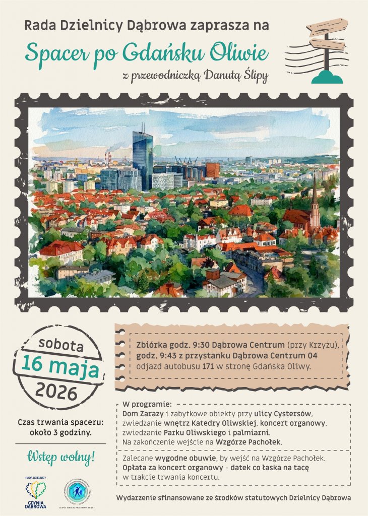 Rada Dzielnicy Dąbrowa zaprasza na cykl spacerów z przewodniczką Danutą Ślipy. 16 maja (sobota) - Spacer po Gdańsku Oliwie Zbiórka godz. 9:30 Dąbrowa Centrum (przy Krzyżu), godz. 9:43 z przystanku Dąbrowa Centrum 04 odjazd autobusu 171 w stronę Gdańska Oliwy W programie: Dom Zarazy i zabytkowe obiekty przy ulicy Cystersów, zwiedzanie wnętrz Katedry Oliwskiej, koncert organowy, zwiedzanie Parku Oliwskiego, palmiarni. Na zakończenie wejście na Wzgórze Pachołek, skąd z wieży widokowej rozpościera się piękna panorama na Zatokę Gdańską i okolice.Czas trwania spaceru: około 3 godziny.Zalecane wygodne obuwie, by wejść na Wzgórze Pachołek. Opłata za koncert organowy - datek co łaska na tacę w trakcie trwania koncertu. 21 czerwca (niedziela) - Czerwcowy Spacer po Gdańsku Zbiórka: godz. 9:45 przy przystanku Dąbrowa Centrum (przy Krzyżu), SKM Gdynia Redłowo - Gdańsk Śródmieście W programie: zwiedzanie Głównego Miasta, w tym: Kościół Mariacki (wnętrza), ulice Trakt Królewski, Mariacka, Chlebnicka, Św. Ducha, bramy miejskie i wodne, Długie Pobrzeże, Wyspa Spichrzów, Żuraw. Mnóstwo ciekawostek z życia dawnych mieszkańców Gdańska.Czas trwania spaceru: około 2,5 - 3 godziny. 5 września (sobota) - Spacer po Gdyni „Mam marzenie i nie zawaham się je spełnić". Zbiórka: godz. 15:00 przy Pomniku Piłsudskiego w Parku Centralnym w Gdyni W programie: szlak spełnionych gdyńskich marzeń wg autorskiego pomysłu przewodniczki Danki Ślipy. Opowieści morskie, modernistyczne i filmowe. Poznamy bliżej takie postaci jak Karol Olgierd Borchardt, Marszałek Piłsudski, Franciszka Cegielska, Sue Ryder, Leonid Teliga, Danuta Baduszkowa. Spacer zakończy się przy pomniku Marzyciela.Czas trwania spaceru: około 3 godziny.Zapraszamy! Opublikowano: 28.04.2026 09:54 Autor: Joanna Majchrowska (joanna.majchrowska@gdynia.pl) Zmodyfikowano: 28.04.2026 10:27 Zmodyfikował: Paweł Jałoszewski