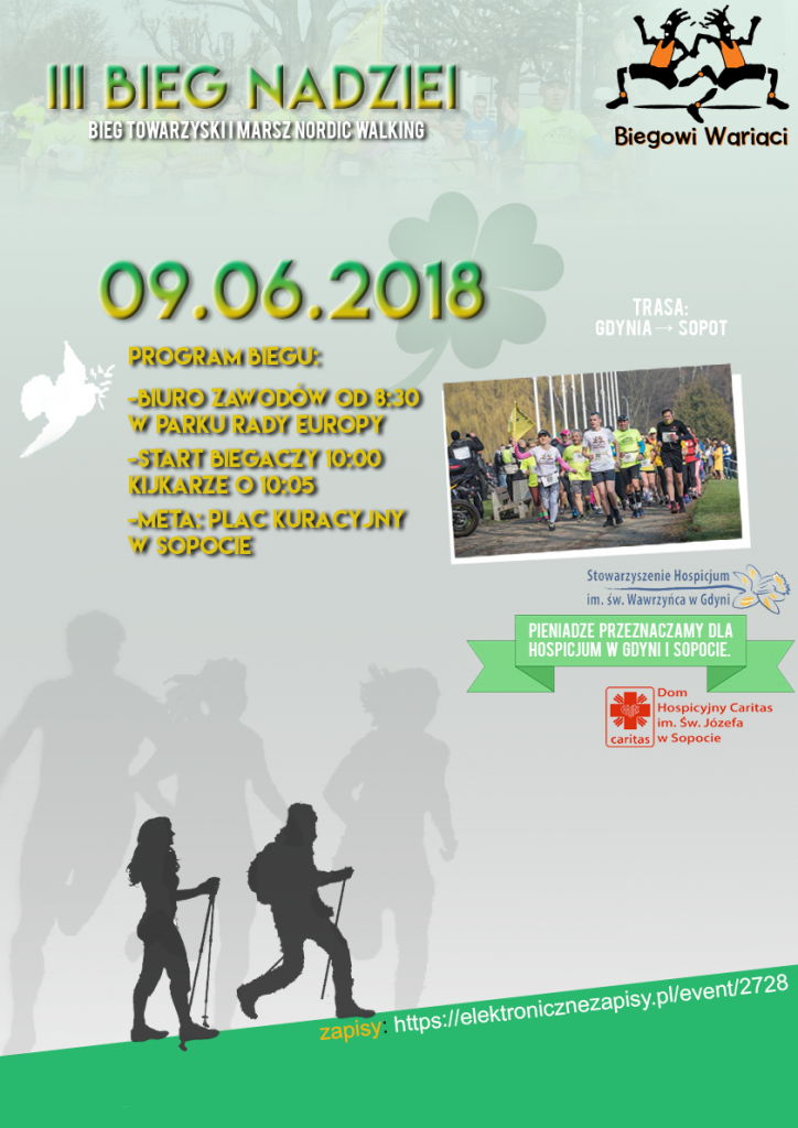 III Bieg Nadziei to kolejna edycja sportowego wydarzenia, które ma na celu zwrócenie uwagi mieszkańców Trójmiasta na potrzeby ruchów hospicyjnych oraz zachęcenie do wspierania pomorskich domów hospicyjnych. Organizatorami są drużyna sportowa „Biegowi Wariaci” oraz hospicjum w Gdyni i w Sopocie.Ten wyjątkowy bieg ma charakter towarzyski i polega na wspólnym pokonaniu trasy w żółtych strojach symbolizujących żonkile - symbol nadziei i ruchu hospicyjnego. Trasa przebiegać będzie przez malownicze tereny Gdyni i Sopotu przy brzegu morza. Zawodnicy wystartują 9 czerwca o godzinie 10:00 z Bulwaru Nadmorskiego w Gdyni biegnąc Kępą Redłowską, Parkiem Kolibkowskim, Promenadą Królowej Marysieńki, Parkiem Północnym do Molo w Sopocie.Zapisy prowadzone są przez stronę www.elektronicznezapisy. pl, a całkowita zebrana kwota zostanie przeznaczona na zakup sprzętu medycznego dla domów hospicyjnych.Po raz pierwszy w ramach Biegu Nadziei odbędzie się towarzyski marsz nordic walking. Tą samą trasą, w tym samym czasie i z tą samą dawką pozytywnej energii! Cel również ten sam – zakup sprzętu medycznego podtrzymującego życie najbardziej chorym mieszkańcom Gdyni i Sopotu. Szczegółowe informacje na stronie wydarzenia: https://www.facebook.com/events/127958514713478/ Opublikowano: 15.05.2018 08:49 Autor: Lechosław Dzierżak (lechoslaw.dzierzak@gdynia.pl)