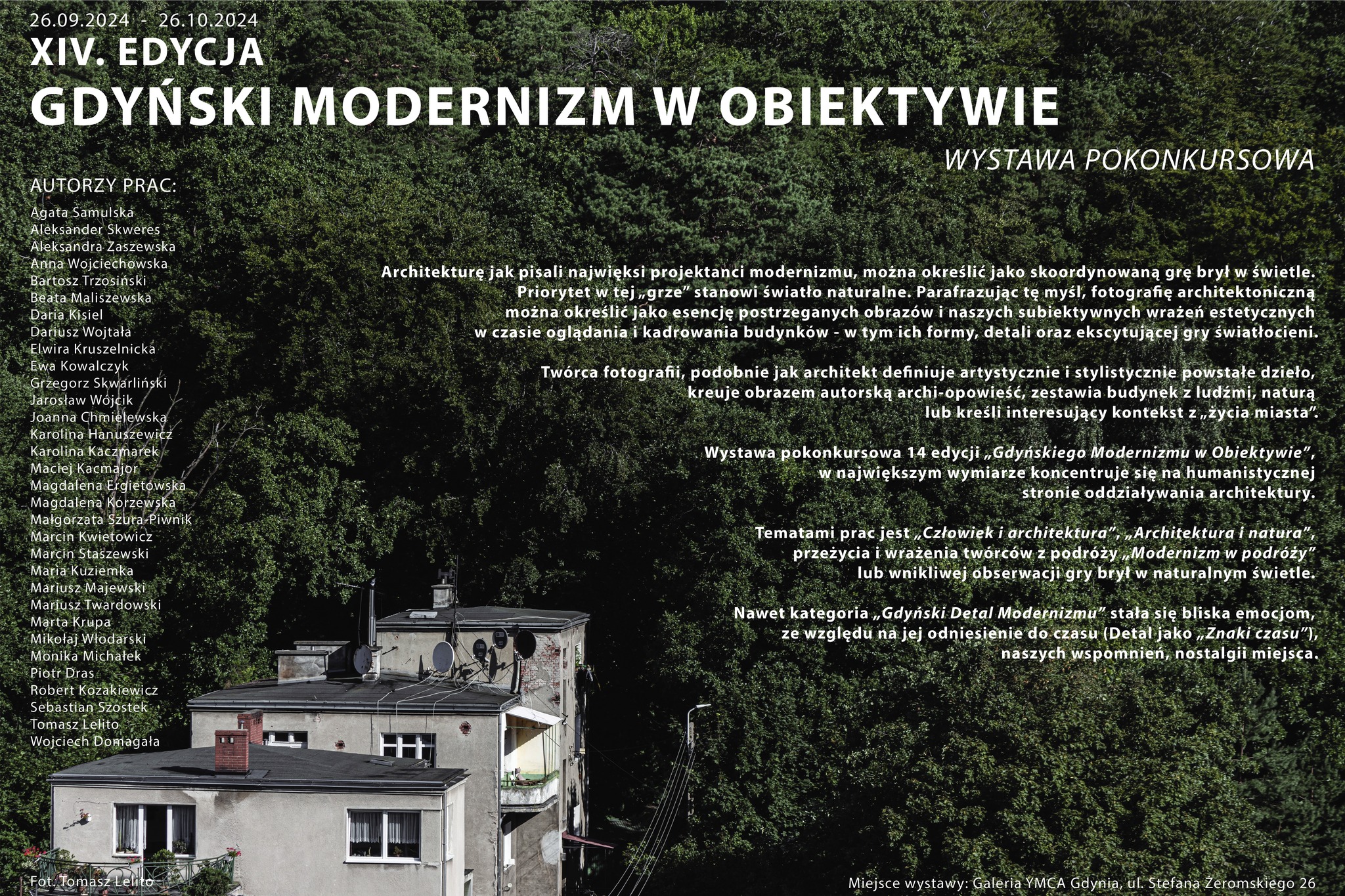 Zapraszamy do „Galerii YMCA Gdynia” ul. Stefana Żeromskiego 26 w Gdyni (antresola w auli budynku YMCA) na wystawę pokonkursową „Gdyńskiego Modernizmu w Obiektywie 2024 – edycja rozszerzona”, organizowaną wspólnie przez „Wytwórnię Pomysłów Studniak”, „Gdyński Szlak modernizmu” oraz Agencję Rozwoju Gdyni we współpracy z Partnerami. Wystawa pokonkursowa 14. edycji „Gdyńskiego Modernizmu w Obiektywie” w największym wymiarze koncentruje się na humanistycznej stronie oddziaływania architektury. Tematami prac jest „Człowiek i architektura”, „Architektura i natura”, przeżycia i wrażenia twórców z podróży („Modernizm w podróży” lub wnikliwej obserwacji gry brył w naturalnym świetle. Nawet kategoria „Gdyński Detal Modernizmu” stała się bliska emocjom, ze względu na jej odniesienie do czasu (Detal jako „Znaki czasu”), naszych wspomnień, nostalgii miejsca.Architekturę, jak pisali najwięksi projektanci modernizmu, można określić jako skoordynowaną grą brył w świetle. Priorytet w tej „grze” stanowi światło naturalne. Parafrazując tę myśl, fotografię architektoniczną można określić jako esencję postrzeganych obrazów i naszych subiektywnych wrażeń estetycznych w czasie oglądania i kadrowania budynków – w tym ich formy, detali oraz ekscytującej gry światłocieni.Twórca fotografii, podobnie jak architekt definiuje artystycznie i stylistycznie powstałe dzieło, kreuje obrazem autorską archi-opowieść, zestawia budynek z ludźmi, naturą lub kreśli interesujący kontekst z „życia miasta”.Kuratorami wystawy są Mirosław Studniak oraz Małgorzata Szura-Piwnik.Miejsce: „Galeria YMCA Gdynia” ul. Stefana Żeromskiego 26 w Gdyni (antresola w auli budynku YMCA)Termin: otwarcie wystawy zaplanowano 26 września o godz. 16:15.Czas trwania i otwarcia: Wystawa będzie dostępna do 26 października 2024, we wszystkie dni tygodnia, w godzinach otwarcia obiektu.Na wystawie zobaczymy prace autorów: Agata Samulska Aleksander Skweres Aleksandra Zaszewska Anna Wojciechowska Bartosz Trzosiński Beata Maliszewska Daria Kisiel Dariusz Wojtała Elwira Kruszelnicka Ewa Kowalczyk Grzegorz Skwarliński Jarosław Wójcik Joanna Chmielewska Karolina Hanuszewicz Karolina Kaczmarek Maciej Kacmajor Magdalena Ergietowska Magdalena Korzewska Małgorzata Szura-Piwnik Marcin Kwietowicz Marcin Staszewski Maria Kuziemka Mariusz Majewski Mariusz Twardowski Marta Krupa Mikołaj Włodarski Monika Michałek Piotr Dras Robert Kozakiewicz Sebastian Szostek Tomasz Lelito Wojciech Domagała Zdjęcie tytułowe: fotografia wyróżniona w kat. Archi-Ikony, autor: Beata Maliszewska. Opublikowano: 26.09.2024 11:28 Autor: Paweł Jałoszewski (pawel.jaloszewski@gdynia.pl) Zmodyfikowano: 26.09.2024 11:30 Zmodyfikował: Paweł Jałoszewski