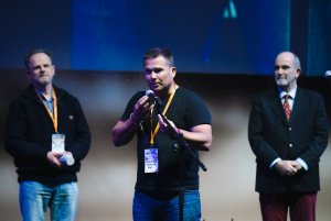 Maciej Krzeptowski odbiera Kolosa z rąk prezydenta Gdyni Wojciecha Szczurka oraz Gabrieli Doby // fot. Anna Rezulak