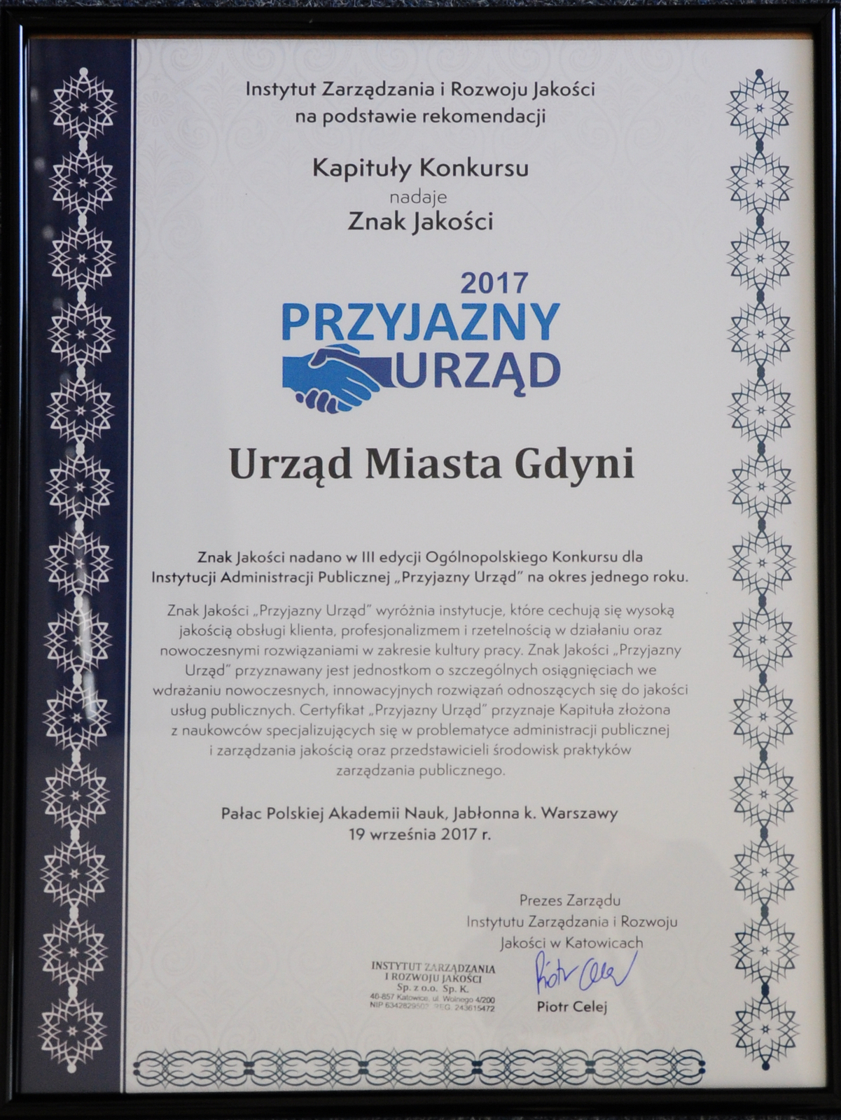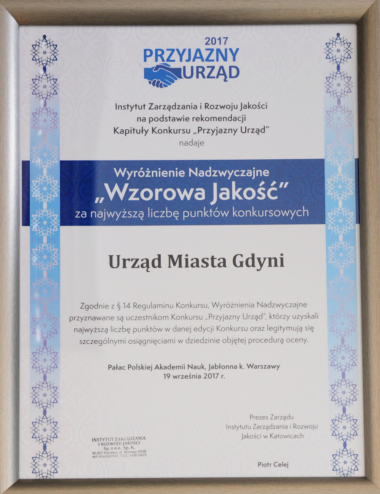 Gdynia nagrodzona w trzech kategoriach w konkursie Eco-Miasto 8.11.2017Skuteczna gospodarka odpadami komunalnymi, poprawa efektywności energetycznej budynków i zrównoważona mobilność – za to została doceniona Gdynia w jednym z największych ekologicznych konkursów miejskich Eco-Miasto. 8 listopada podczas Międzynarodowej Konferencji „Innowacyjne Eco-Miasto: zdrowe środowisko, zdrowi ludzie” w Centrum Nauki Kopernik w Warszawie odbyło się wręczenie nagród. Trzy odebrał prezydent Gdyni Wojciech Szczurek.Eco-Miasto to obecnie największy ekologiczny konkurs miejski, który umożliwia samorządom wymianę doświadczeń na temat realizacji przedsięwzięć zrównoważonego rozwoju. W piątej edycji wzięły udział aż 63 miasta nadsyłając 93 formularze zgłoszeniowe. Rywalizowały w sześciu kategoriach: gospodarka wodna, gospodarka odpadami, efektywność energetyczna budynków, systemy energetyczne, mobilność zrównoważona oraz zieleń a powietrze. Gdynia nadesłała projekty realizowane we wszystkich kategoriach i zwyciężyła w połowie z nich. Gdynia uhonorowana Polską Nagrodą Innowacyjności 26.10.2017Podczas odbywającego się w Zielonej Górze V Polskiego Kongresu Przedsiębiorczości, Gdynia została uhonorowana Polską Nagrodą Innowacyjności. To ogólnopolski laur gospodarczy przyznawany przez Radę Programową Polskiego Kongresu Przedsiębiorczości i Polską Agencję Przedsiębiorczości. Gdynia Polską Nagrodą Innowacyjności została wyróżniona w kategorii Smart City. Miasto zostało docenione za wdrożony certyfikat ISO, innowacyjne rozwiązania w zakresie usług publicznych, zainicjowanie prac nad car-sharingiem oraz wspieranie przedsiębiorczości.Nominacje do tego tytułu przyznawane są przez redakcję Forum Przedsiębiorczości w Dzienniku Gazecie Prawnej. W tym roku nagroda została przyznana już po raz piąty, a Gdynia jest jedynym miastem, które w tegorocznej edycji zostało tym laurem nagrodzone. Wojciech Szczurek Liderem z Powołania 24.10.2017Lider z Powołania jest programem dedykowanym charyzmatycznym gospodarzom miast i menadżerom, założycielom organizacji charytatywnych i naukowych. Liderem zostają także trenerzy sportowi, członkowie ośrodków kulturalnych i naukowych, a także rektorzy uczelni. Liderem z powołania za efektywne zarządzanie miastem, otrzymał prezydent Gdyni Wojciech Szczurek.Liderem z powołania jest osoba, która pasję przekuwa w sukces, służący nie tylko własnej satysfakcji, ale i przysługujący się społeczeństwu. Ważnym elementem, za który doceniono prezydenta Gdyni, jest umiejętność łączenia i dążenia do współdziałania ze sobą wielu dziedzin życia. Zarówno edukacji, jak i przedsiębiorczości z kulturą. Gdynia Sportowym Miastem Roku 2017 16.10.2017Podczas odbywającego się w Toruniu II Kongresu Miast Sportowych Gdynia otrzymała statuetkę „Sportowego Miasta Roku”. Miasto z morza i marzeń pretendowało do tytułu wraz z 30 innymi miejscowościami.Gdynia otrzymała tytuł Sportowego Miasta Roku w kategorii od 100 tysięcy do 250 tysięcy mieszkańców. Statuetkę dyrektorowi Gdyńskiego Centrum Sportu wręczył halowy Mistrz Świata i Europy w siedmioboju Sebastian Chmara. Gdynia Eko-Samorządem roku 6.10.2017Podczas odbywających się w Warszawie II Międzynarodowych Targów EkoFloty 2017 Gdynia została wyróżniona nagrodą w kategorii Eko-Samorząd roku. To docenienie miasta za zainicjowanie trójmiejskiego programu car-sharingowego i rozwój floty trolejbusów.II Międzynarodowe Targi EkoFlota 2017: Innowacje, Ekologia, Mobilność to impreza promująca nowoczesne rozwiązania związane z szeroko rozumianą mobilnością i ochroną środowiska. Wydarzenie gromadzi specjalistów z różnych branż z Polski i zagranicy, dla których jest szansą do dyskusji o rozwoju rynku pojazdów elektrycznych i infrastruktury w Europie Środkowo-Wschodniej. Zwieńczeniem pierwszego dnia targów było wręczenie nagród dla najbardziej ekologicznych i innowacyjnych pojazdów, rozwiązań oraz flot 2017 roku. Wręczone zostały również nagrody specjalne, m.in. dla najlepszych menadżerów flot oraz najbardziej ekologicznego samorządu. Za zainicjowanie trójmiejskiego programu car-sharingowego oraz rozwój floty trolejbusów nagrodą dla najbardziej ekologicznego samorządu została uhonorowana Gdynia. Kapituła rozważała również kandydatury takich miast jak Warszawa, Lublin, Słupsk, Szczecin, Zabrze i Zielona Góra. Nagrodę odebrał Bartosz Bartoszewicz, wiceprezydent Gdyni. „Przyjazny Urząd” 19.09.2017Rekordowa w Polsce ilość urzędowych spraw, które załatwimy on-line, okienka otwarte popołudniami i w soboty, przyjazna obsługa. To między innymi za to gdyński Urząd Miasta otrzymał miano „Przyjaznego Urzędu”. Wręczenie statuetek odbyło się podczas gali finałowej konkursu w pałacu Polskiej Akademii Nauk w Jabłonnej 19 września.To już kolejny raz, kiedy Urząd Miasta Gdyni zdobywa laury w dziedzinie dobrego zarządzania. Najnowszym osiągnięciem jest wygrana w Ogólnopolskim Konkursie o Znak Jakości „Przyjazny Urząd”. Jego organizatorem jest Instytut Zarządzania i Rozwoju Jakości z Katowic. Kapituła, w której skład wchodzą eksperci i naukowcy, postanowiła wyróżnić gdyński Urząd za „ciągłą chęć podnoszenia standardów jakościowych i wdrażania innowacyjnych rozwiązań w zakresie obsługi klienta”.Konkurs adresowany jest do jednostek sektora publicznego, np. urzędów wojewódzkich, marszałkowskich, urzędów miast czy pracy. Nagradza placówki, gdzie wysoka jakość obsługi, profesjonalizm oraz kultura pracy to główne zasady, jakimi kierują się ich pracownicy. Równie ważnym kryterium oceny jest wdrażanie nowoczesnych rozwiązań informatycznych, które usprawniają obsługę klienta. Nowoczesna hala sportowa przy VI Liceum Ogólnokształcącym budową Roku 2016 Nowoczesna hala sportowa przy VI Liceum Ogólnok
