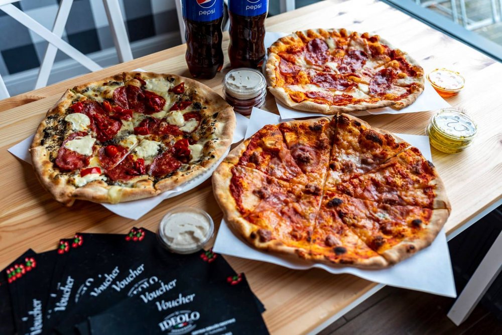 Im Angebot: Pizza in verschiedenen Größen, mit dünnem oder dickem Teig, hergestellt aus original italienischen Produkten. Auch mit Lieferung.