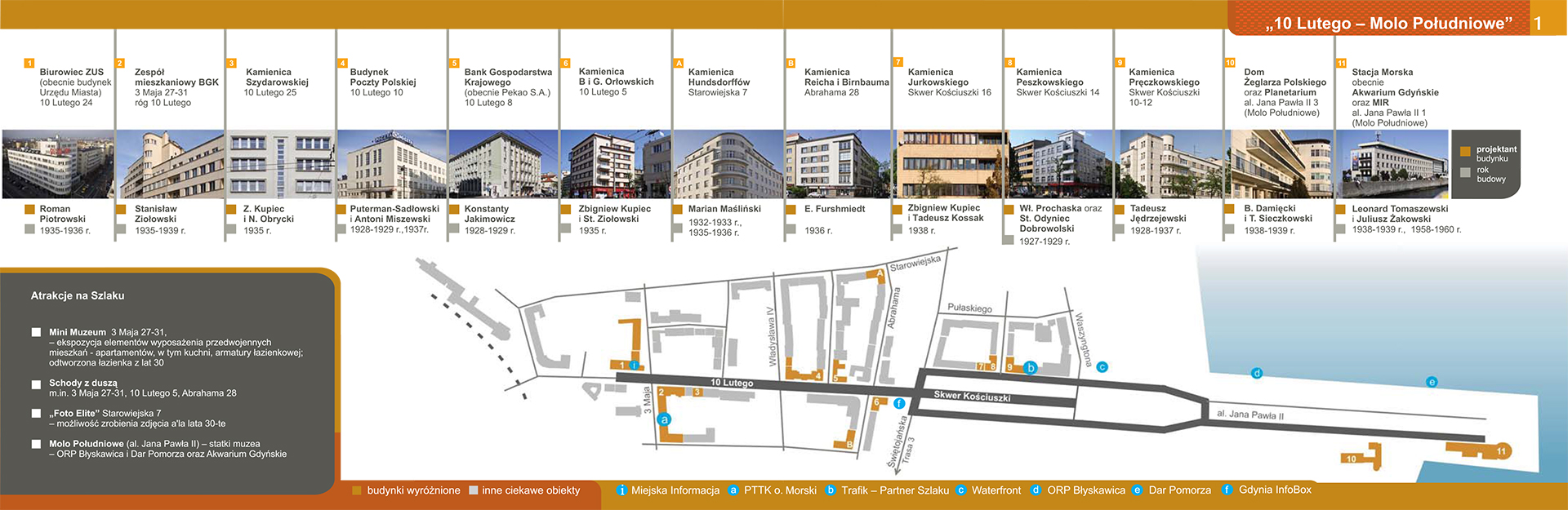 Der einzige solche Weg in Polen, der, wenn sie begrüßt wird, "uns zuzwinkert" und ein Fragment einer leuchtenden Meeresperspektive enthüllt. Auf dem Weg zum Meer kommen Sie sehr schnell in engen Kontakt mit den Perlen der Moderne der 1930er Jahre, einschließlich des legendären Paares von Gdynias "Ocean-Lining Houses". Ein wahrer Genuss, nicht nur für Experten, ist das ZUS-Bürogebäude (derzeit das Rathaus) und ein Besuch des BGK-Wohnkomplexes - Besichtigung der Käfige, des Schutzsystems oder Blick in die "Seele" der Treppe. Dank der Initiative der Wohngemeinschaft verfügt das Gebäude über ein Mini-Museum mit einer Ausstellung von Fotografien, alten Drucken, Möbeln und einem rekonstruierten Badezimmer aus der Vorkriegszeit. Der Modernismus im Abschnitt der Lutego-Straße 10 begleitet uns auf der gesamten Strecke. Wir kommen an Szydarowskas Mietshaus und dem Postgebäude vorbei, das sich durch eine helle Fassade, geometrische Form und rhythmische Verglasung auszeichnet. Das Eckwohnhaus der Familie Orłowski mit einer ausdrucksstarken, geometrischen Form ist das erste Luxusprojekt in Gdynia. Ein wichtiger Abschnitt des Weges verläuft entlang des Kościuszko-Platzes, wo wir auf ein interessantes Jurkowski-Mietshaus treffen, das ein hervorragendes Beispiel für einen internationalen Stil mit einer eleganten Fassade ist, die mit Klinker verkleidet und horizontal mit Bändern aus Mahagoni-Fenstern geschnitten ist. Das Mietshaus von Pręczkowski hingegen ist ein Meilenstein in der Moderne Gdynias. Es ist ein Objekt, in dem zum ersten Mal kühne ovale Formen verwendet wurden, und das gesamte Design bezieht sich auf den Schiffsstil. Der des Modernismus führt Sie zur südlichen Mole, zum Gebiet, in dem die Stadt auf das Meer trifft. Hier begegnen Sie den Symbolen der Gdynia-Moderne, die ihr maritimes Panorama schaffen, einschließlich des Baus des "Sailor's House" (heute Maritime Universität) und einer wichtigen Attraktion der Stadt - dem Gdynia Aquarium. Do pobrania Gdyński Szlak Modernizmu - trasa ul. 10 Lutego - Molo Południowe jpg636kb Gdyński Szlak Modernizmu - folder pdf4266kb Opublikowano: 27.08.2025 13:09 Autor: Estera Grubert (estera.grubert@gdynia.pl) Zmodyfikowano: 28.08.2025 12:48 Zmodyfikował: Estera Grubert