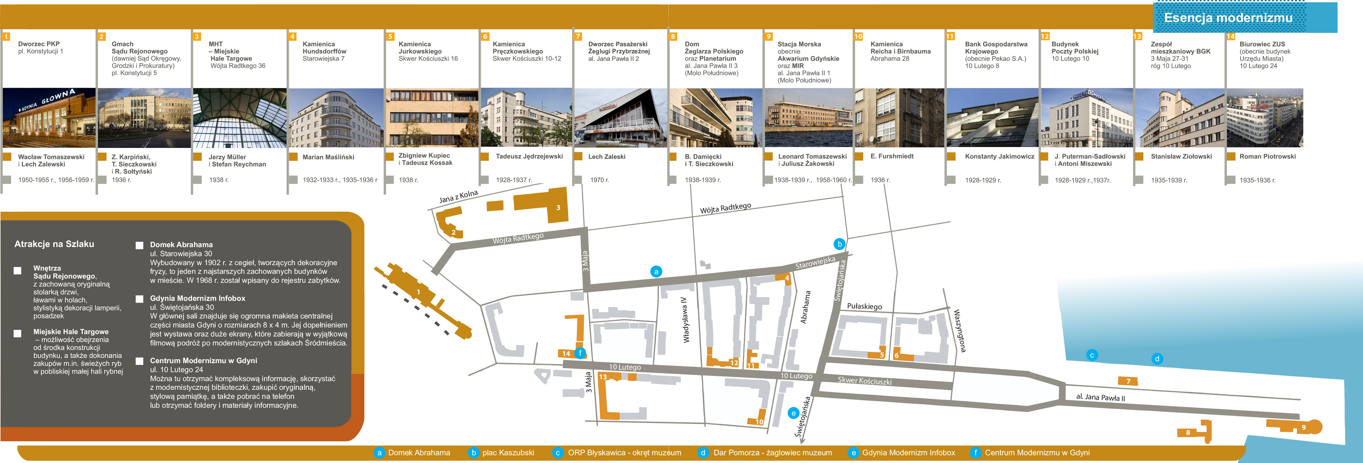 Ein „Muss“ in Gdynia, Perlen des Modernismus, die berühmtesten Denkmäler und Ikonen der Architektur der Stadt.Der Spaziergang beginnt am Konstytucji-Platz. Wir starten am Bahnhof, gehen am Gebäude des Amtsgerichts vorbei und laufen entlang der Wójta Radtkego Straße zum Komplex der Markthallen. Wenn wir die Starowiejska Straße in Richtung Jana Pawła II Allee entlanggehen, sind das Haus von Abraham und das Mietshaus der Familie Hundsdorff sehenswert.Wenn man die Route fortsetzt, lohnt es sich, in der Gdynia Modernismus Infobox (ul. Świętojańska 30) anzuhalten, um eine Ausstellung zu sehen, die den Ikonen des Gdingener Modernismus gewidmet ist, sowie ein großformatiges Modell von Gdynia mit einem beleuchteten Bereich der modernistischen Innenstadt.Beim Spaziergang durch die Straße 10 Lutego kann man einige herausragende modernistische Gebäude nicht übersehen: das Gebäude der Bank Gospodarstwa Krajowego, das prächtige Gebäude der Polnischen Post, eines der modernsten Wohngebäude der Vorkriegszeit in Polen - der Wohnkomplex der Bank Gospodarstwa Krajowego, genannt „Bankowiec“, und ein beeindruckendes Gebäude, das an ein Überseeschiff erinnert, das ehemalige Bürogebäude der ZUS (Polnische Sozialversicherungsanstalt). Letzteres beherbergt heute u.a. das Zentrum für Modernismus in Gdynia (10 Lutego Str. 24).Entfernung: ca. 4,5 kmBesichtigungszeit: ca. 2hMehr Informationen: modernizmgdyni.pl Do pobrania Esencja modernizmu jpg1033kb Folder Modernistyczne Śródmieście Gdyni - polski kandydat do wpisu na Listę Światowego Dziedzictwa UNESCO pdf5189kb Opublikowano: 27.08.2025 13:10 Autor: Estera Grubert (estera.grubert@gdynia.pl) Zmodyfikowano: 06.11.2025 09:05 Zmodyfikował: Estera Grubert